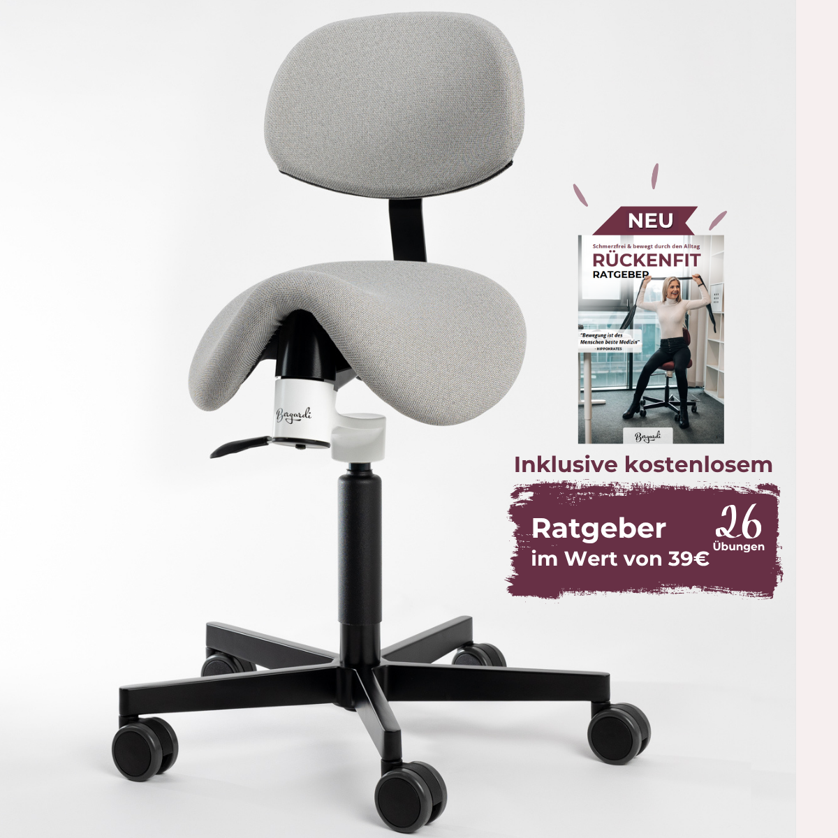Der Sattelstuhl Aurelia von Bergardi ist die gesündeste Optionen für das Sitzen am Arbeitsplatz. Dank des großen Sitzwinkels von bis zu 130 Grad wird die natürliche Haltung des Körpers unterstützt und die Belastung von Hüfte, Rücken und der Bandscheiben reduziert. Die integrierte Bewegungsfunktion fördert zudem ein angenehmes Training. Das Becken wird gestärkt und Rückenschmerzen vorgebeugt. Damit bietet der Bergardi-Sattelstuhl eine ideale Kombination aus aufrechter Körperhaltung und Gesundheit am Arbeitsplatz. Bitte beachte, dass für das Sitzen auf dem Sattelstuhl ein höhenverstellbarer Schreibtisch notwendig ist! Zu Beginn kann ein Muskelkater auftreten und Druckpunkte auf den Sitzbeinhöckern und Schenkelinnenseiten entstehen. Die Eingewöhnungsphase beträgt rund 2-4 Wochen.