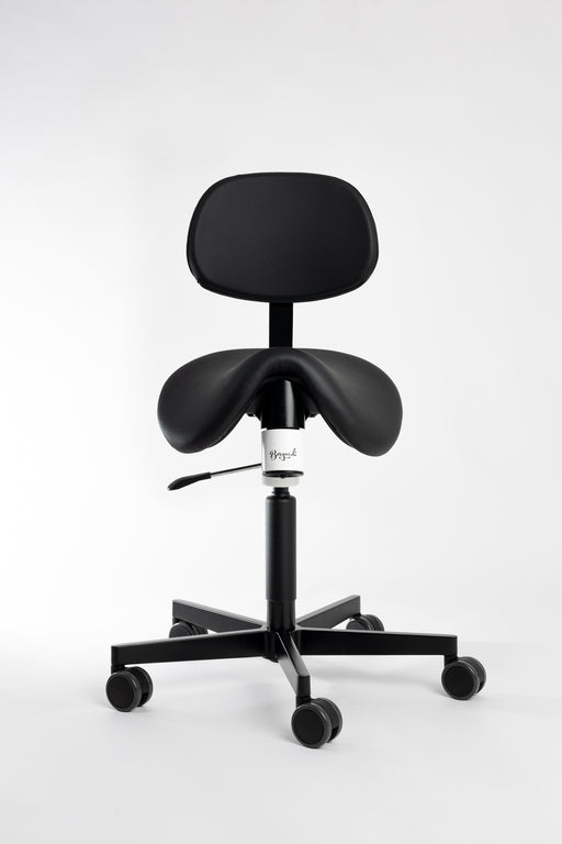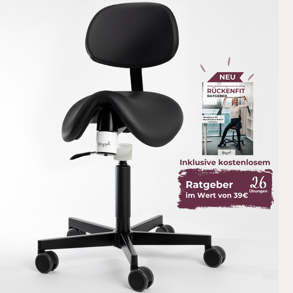 Der ergonomische Sattelstuhl Aurelia unterstützt eine aufrechte Sitzhaltung und beugt Rückenschmerzen aktiv vor.
